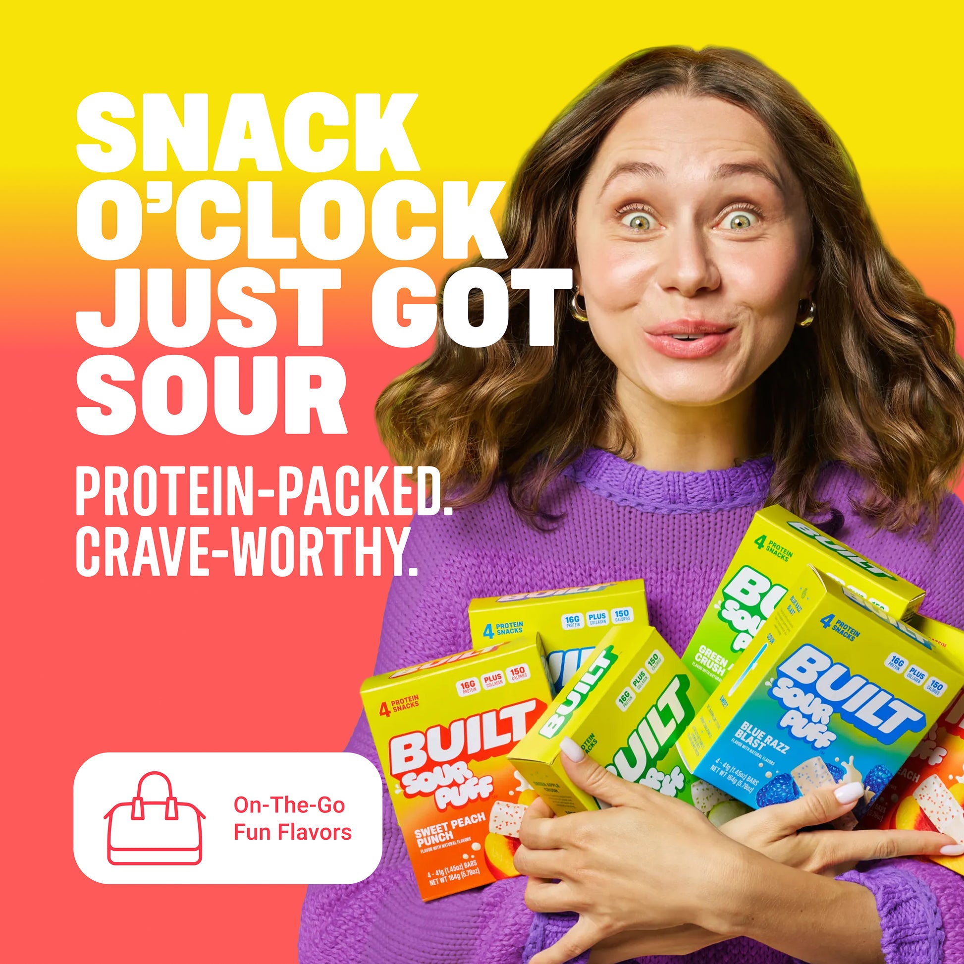 Introducing BUILT Sour Puff! The marshmallowy, protein-packed, goodness of BUILT Puff you know and love, with a tangy center -- a sweet and tart coating -- and topped with crunchy sugar sprinkles!